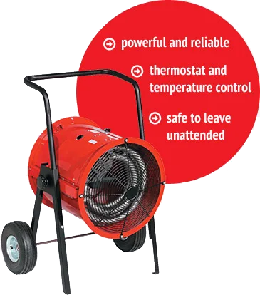 Our electric heaters generate 50,000 to over 200,000 Btu of heat, running from a standard electrical outlet – truly plug and play. They don’t need venting, so we can place them anywhere without disturbance – we do have a ducting option for the highest power heater.